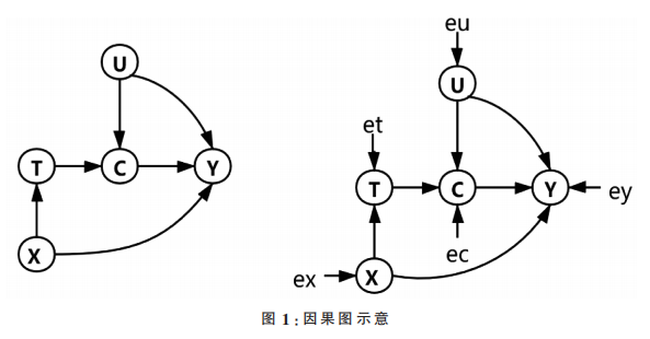 因果图由三项元素构成:节点、线段和箭头。首先是代表特定变量的节点,本文统一使用T表示解释变量(干预变量),Y表示被解释变量(效应),X表示信息可被获取的相关变量,U表示信息不可获取的相关变量,其他变量在具体案例中特别指定,如图1左图中变量C即充当T和Y之间的中介变量。其次为代表两变量间存在因果关联的箭头线段,箭头的方向从“因”到“果”,如图1左图中变量X有两条箭头分别指向变量T和Y,即代表X能够导致T和Y。最后,当图中两个变量间不存在箭头线时,代表两变量之间不存在因果关联,这是一项相当强的排斥性约束,需要研究者以理论信心和经验证据作为支撑,在图1左图中则意味着X与C、U与T、T与Y之间均不存在直接的因果关系。