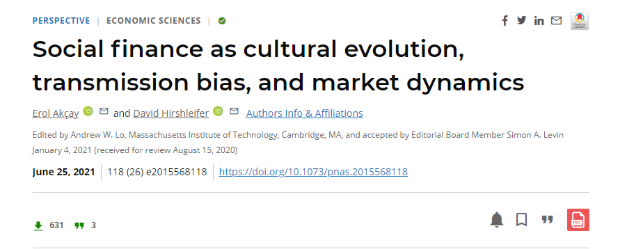 2021年6月,发表于PNAS的一篇论文主张采用一种新的范式——社会金融(social finance),来理解金融市场。社会金融研究金融特征的文化演变,形成这一过程的传播偏差,以及由此产生的市场动力学。它借鉴了古典金融学、行为金融学、演化金融学和文化演化理论中的概念。文章回顾了在社会网络结构和制度环境背景下,金融市场中信念、投资和价格制定的文化演变,强调了一般演化理论和金融应用之间的联系,并提出了社会金融未来研究的方向。