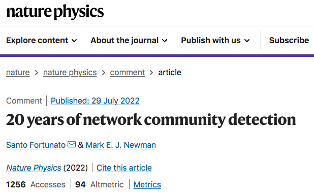 网络数据分析中的一个基本技术挑战是自动发现社团——强连接或共享相似特性或角色的节点组。最近网络科学家Santo Fortunato和Mark Newman在Nature Physics发表评论文章,回顾了过去20年来该领域的进展。