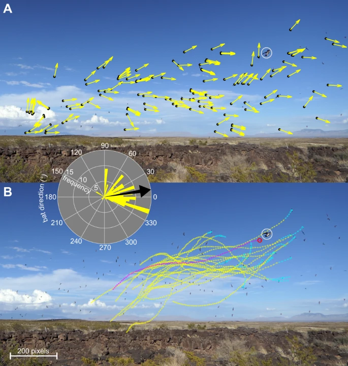 图:墨西哥无尾蝙蝠在斯温森鹰袭击期间的群体行为。(A)一个固定的摄像机拍摄的一个来袭的鹰(白色圆圈) ,追踪期间蝙蝠的即时飞行方向(黄色箭头)(黑点)。(B)图中20只蝙蝠的飞行轨迹(黄点)导致了捕捉尝试;飞行轨迹采样间隔为 0.02 秒,最后 5 点用青色突出显示。被老鹰(白色圆圈)攻击的蝙蝠(红色圆圈)的运动轨迹以品红色显示。