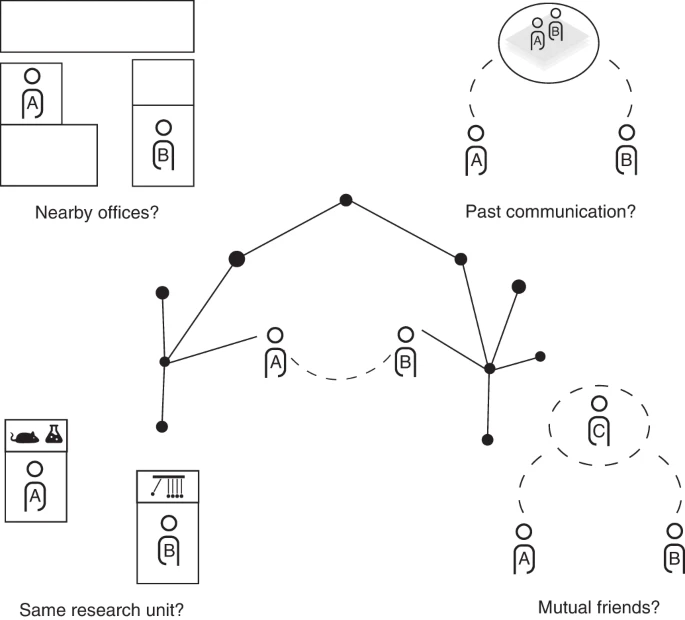 图:模型机制说明。在我们的关系选择模型中,两个人互动的概率取决于四个关键机制:共同定位、两人是否属于同一个研究单位、两人是否有相互联系以及他们过去的交流模式。