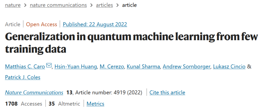 论文题目:Generalization in quantum machine learning from few training data 论文来源:Nature Communications 论文链接:https://www.nature.com/articles/s41467-022-32550-3