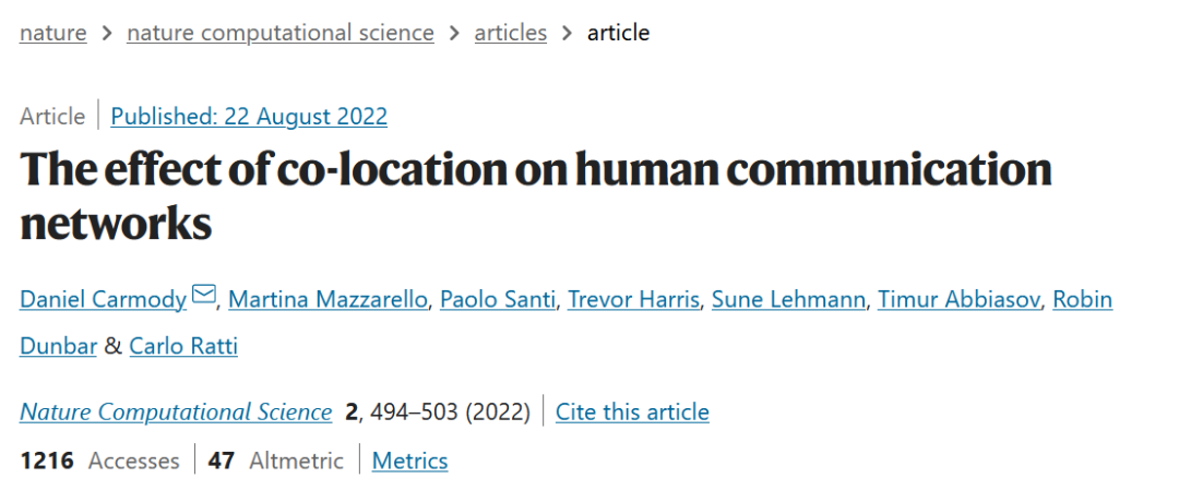 论文题目:The effect of co-location on human communication networks 论文来源:Nature Computational Science 论文链接:https://www.nature.com/articles/s43588-022-00296-z 评论:https://www.nature.com/articles/s43588-022-00302-4