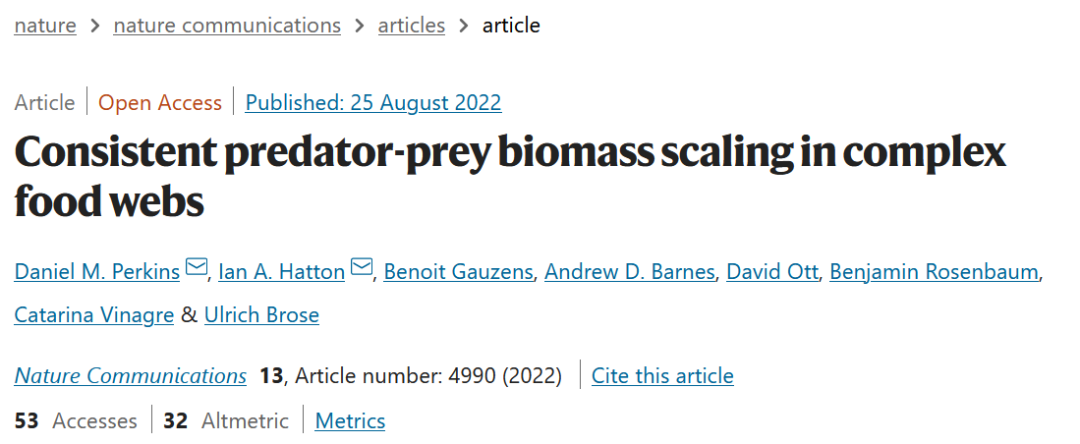 论文题目:Consistent predator-prey biomass scaling in complex food webs 论文来源:Nature Communications 论文链接:https://www.nature.com/articles/s41467-022-32578-5