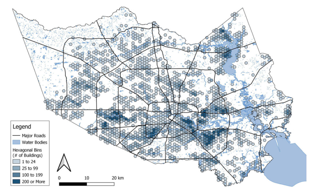 图:气候变化导致的洪水地图。每个六边形表示在哈维飓风期间,如果没有气候变化的额外影响,德克萨斯州哈里斯县本不会被淹的住房数量。