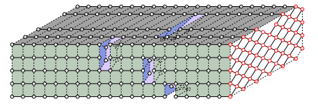 图:三维张量网络对应的 Sycamore 量子电路,53 个量子比特,20 个循环。在张量网络中设计了 4个孔来降低收缩复杂度。每个孔洞是通过破坏选定的两量子比特门的两条边和伴随边而形成的,也即,移除整个两量子比特门。