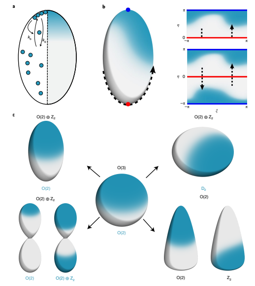 图:细胞极化动力学;(a)胞质蛋白自催化非线性结合细胞膜,缓慢的侧向扩散,导致体内表面对称性自发破坏;(b)当一个函数用表面坐标(ξ, η)表示时,跨越极点的自然周期性就消失了。DFS 方法通过对函数的反射和平移恢复了这种周期性,允许使用二维傅里叶级数进行计算;(c)稳态行为表现出依赖于曲面几何的非平凡。有些曲面甚至可以有多种解。黑色的文字表示表面的对称性,蓝色的文字表示稳态解的对称性。