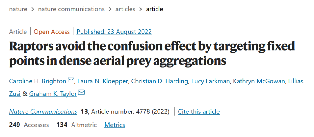 论文题目:Raptors avoid the confusion effect by targeting fixed points in dense aerial prey aggregations 论文来源:Nature Communications 论文链接:https://www.nature.com/articles/s41467-022-32354-5