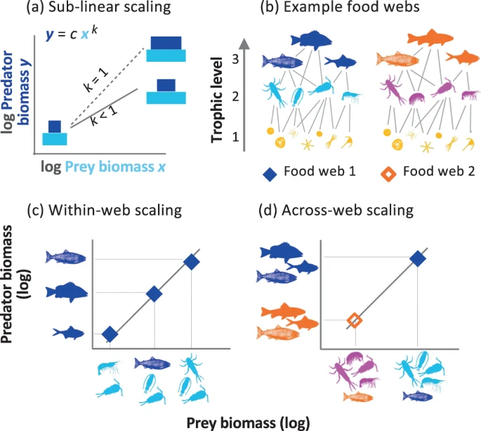 图:跨组织级别的捕食者 – 猎物生物量标度示意图。(a)捕食者-被捕食者幂律指数 k 描述了沿猎物生物量梯度的金字塔形状的相对变化,k=1 表示没有相对变化。(b)自然界中的营养相互作用产生了一个复杂的相互作用网,消费者的营养高度可以采取非整数值。(c)网内标度关系是这样的:每个数据点代表不同捕食者分类群的生物量与他们的猎物的总生物量,在一个单一的食物网中绘制。在所有情况下,所有物种的丰度和平均体质量被用来计算营养生物量。