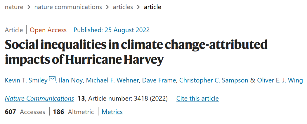 论文题目:Social inequalities in climate change-attributed impacts of Hurricane Harvey 期刊来源:Nature Communications 论文链接:https://www.nature.com/articles/s41467-022-31056-2