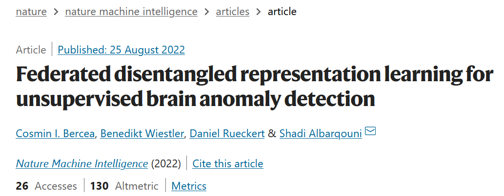 论文题目:Federated disentangled representation learning for unsupervised brain anomaly detection 论文来源:Nature Machine Intelligence 论文链接:https://www.nature.com/articles/s42256-022-00515-2