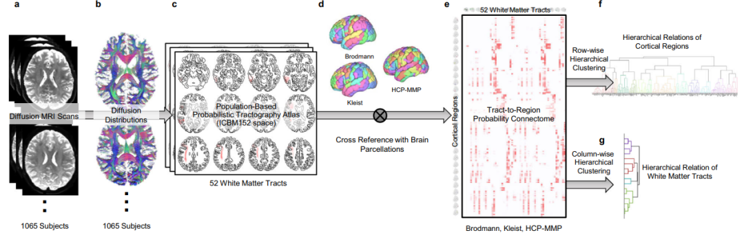 图:构建基于群体的神经束连接组并推导其层次关系的处理流程。(a)弥散 MRI 数据,使用1065名受试者;(b)对数据进行重构,计算纤维示踪的扩散分布;(c)对于每个受试者,52 个白质束使用自动束束描记;(d)利用皮层包块的皮层区域和每个受试者的白质轨迹来推导连接体基质;(e)每个受试者的结果,根据群体概率构建牵引区连接体;(f)对连接体的行向量进行层次聚类,得到皮层区域的层次关系;(g)对列向量进行层次聚类,推导出白质束的层次关系。