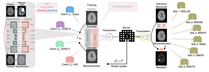 图:架构总述;作者在多客户机上协作训练一个神经网络,每一个都有其对应的本地数据集,对于每一个训练轮次,各个客户机都只将其外观数据发送到服务器而不共享私人的本地数据。服务器收集了全部的参数,然后将更新后的全局模型参数传回。作者以无监督的方式训练神经网络,而不需要额外的专家注释。在此过程中,作者通过学习压缩并重建健康样本来模拟健康的人类大脑解剖结构。