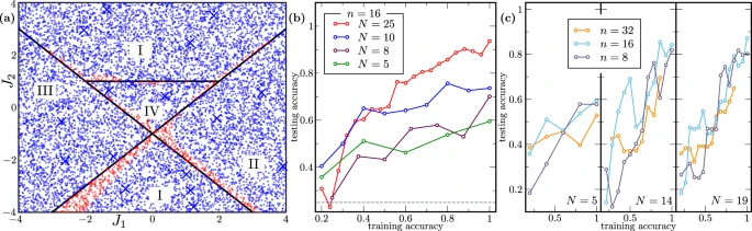 图:量子相位识别的泛化性能。我们采用 QCNN 架构对方程的广义簇哈密顿量 H 的基态进行量子相位识别。通过对 8192 个计算基础测量结果进行采样并将最不频繁的结果作为预测相位来评估 QCNN 分配给 J1-J2 平面中的一个点的相位。(a)可视化了 16 个量子位的 QCNN 性能,用 30 个数据点训练,这些数据点根据分析确定的相图进行标记。蓝色十字表示训练数据点(未显示全部 30 个)。蓝色(红色)圆圈代表正确(错误)分类点。(b)显示,随着训练数据量的增加,训练准确度迅速成为 10,000 个随机采样点上测试准确度的良好预测指标,即测试准确度对训练准确度的依赖性随着斜率随着 N 的增加而近似线性在整个优化过程中,图中不同的点对应了QCNN中不同的参数设置。灰色虚线显示通过随机猜测实现的 25% 的基线准确度。(c)显示,对于不同数量的量子比特,随着训练数据大小的增加,斜率的改善是相似的,这反映了我们的界限预测的 N 对 n 的最坏多对数依赖性。