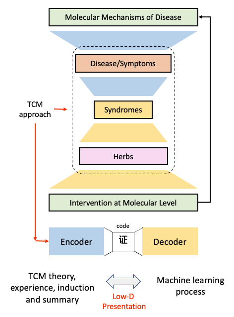 Traditional Chinese Medicine (TCM) characterizes and addresses human physiology, pathology, and diseases diagnosis and prevention using TCM theories and Chinese herbal products. However, the pharmacological principles in TCM theory, the core treasure house of TCM, have rarely been systematically investigated in a top-down manner, which hinders the modernization and standardization of TCM. In this project, we will establish a novel TCM-based network pharmacology framework to discern low-dimensional patterns and principles of human disease and herb-diseases associations. This project will provide a basis for the objectification of the diagnosis and treatment process of TCM, and the knowledge fusion of TCM evidence-based medicine and modern biology.