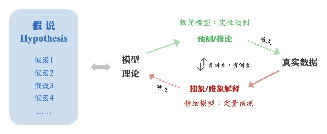 这就包含两种可能的研究范式。其中一种是研究者先通过某种直觉给定假设,然后基于假设提出某种模型或者理论,并通过数学或者计算机手段产生对模型/理论的预测或者推论,最后再去跟真实数据比较看是否吻合。这个过程中的难点在于将推论与真实数据比较,很可能真实数据与推论并不吻合,此时就需要再去重新修改假设直至符合真实数据的情况。这种思路中,最初的模型是简单或粗略的,它从尽可能少的假设出发,通过与真实数据的对比来不断丰富假设。举例来讲,关于地球和太阳的位置关系,是从“地心说”到“日心说”发展的,我们先对二者的运动关系进行假设,然后根据事实数据去验证。严格来讲不能说是谁围绕着谁来运动,而是与太阳系质心位置有关。