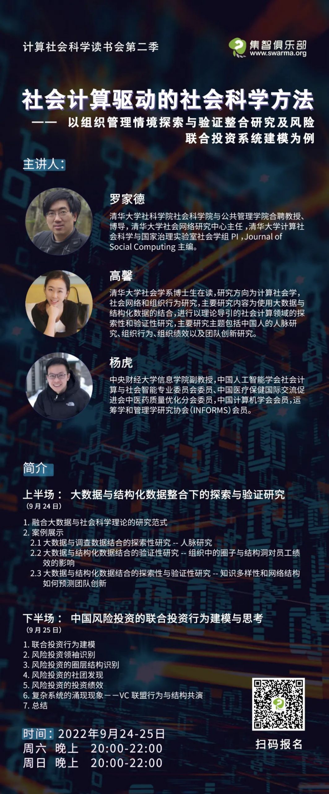 经过了三个多月的学习和讨论,计算社会科学读书会迎来了收官分享,读书会的最后两期,邀请到罗家德老师及其博士生高馨、杨虎老师,通过周末两个晚上的分享,为我们介绍大数据研究的探索与验证的整合、大数据与结构化数据整合下的探索与验证研究案例、中国风险投资的联合投资行为建模与思考等话题。内容干活较多,安排了两个晚上的时间,分为上下两场,时间分别是本周六(9月24日)晚上的20:00-22:00和周日(9月25日)晚上的20:00-22:00,文末扫码预约直播。
