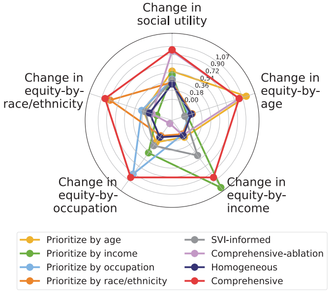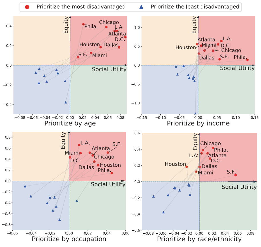 在此模型的基础上,研究人员首先通过仿真分析了常见疫苗分配策略的效果。在美国多个大城市中的仿真结果一致揭示:相比于均匀分配疫苗,如果人们在分配疫苗时优先照顾某个弱势群体(例如年龄维度下的老年人、职业维度下的社会必须工作者),那么就很可能同时提升疫苗的社会效用和该人口属性维度下的公平程度。然而,不同人口属性维度上的公平性往往互相掣肘;例如,仅优先分配给老年人群体时,不同族裔的公平程度下降幅度可达39.6%。由此可见,仅根据人口属性,难以设计出兼顾效用与各维度公平性的疫苗分配策略。