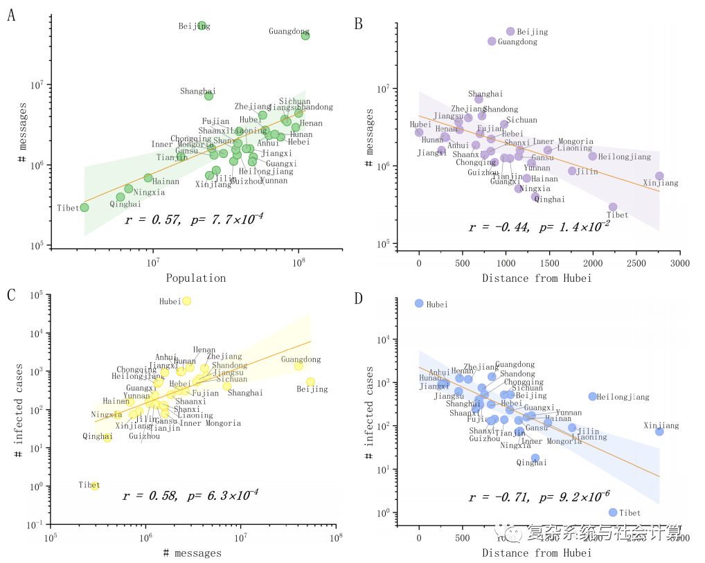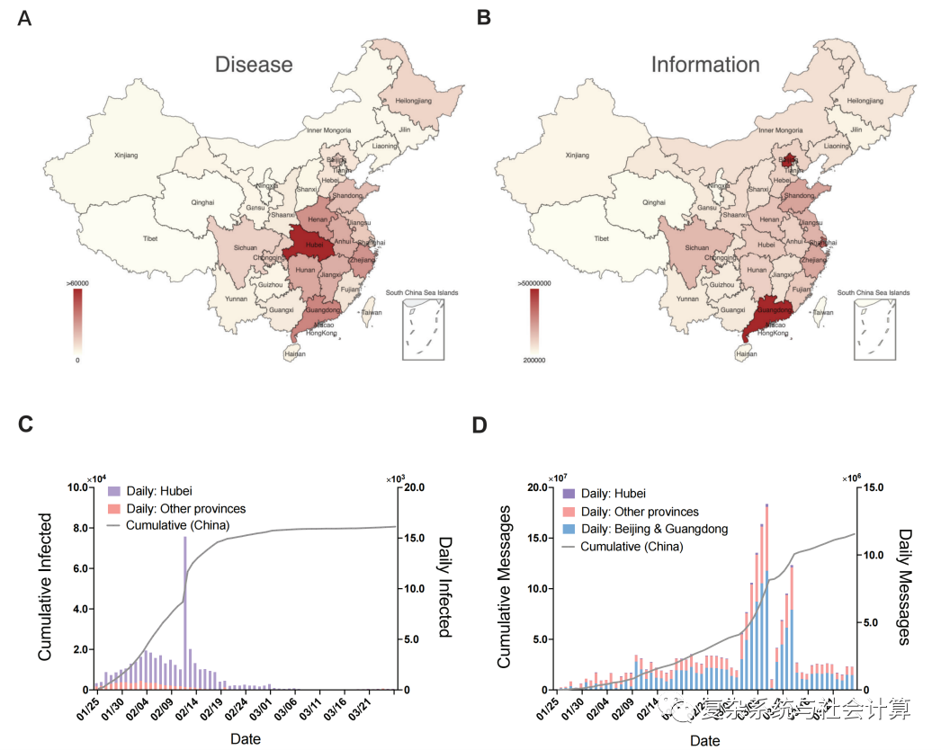 在图2A和图2B中,分别显示了各个省份累计确诊人数以及与COVID-19有关的信息总量在地理上的分布情况,图中颜色越深说明累计确诊人数或信息量越大。首先,可以直观的看出 COVID-19 的确诊患者更多的分布在地理位置上靠近湖北的省份。累计确诊人数最多的十个城市分别为湖北、广东、河南、浙江、湖南、安徽、江西、山东、江苏和重庆。与湖北相邻的六个省份中,有五个的累计确诊人数排在全国前十,分别为安徽、江西、湖南、重庆和河南,说明了在空间上确诊病例的分布呈向湖北集中的趋势。COVID-19相关信息总量最多的十个省份为北京、广东、上海、山东、浙江、江苏、四川、河南、湖北和福建。共有六个省份(湖北、广东、河南、浙江、山东和江苏)不仅是累计感染人数排在全国前十,与 COVID-19 相关的信息总量也排在全国前十。由于COVID-19在湖北爆发,因此湖北的累计确诊人数在全国各省排在第一位,占全国总累计确诊人数的82.8%。然而,通过图2B可以看出,相较于湖北省,北京、上海和广州等发达省份产出的 COVID-19 相关信息的总量才是最大的。这说明,处于发达地区的人,会更多地在线上对 COVID-19 进行讨论。在图2C(D)中,展示了全国的当日确诊人数(信息量)和累计确诊人数(信息量)。总体来看,疾病在1月和2月快速传播,从3月开始确诊人数的增加开始趋于平缓,且大部分的病例来自湖北省(在图2C中由黑色虚线展示)。在2月13号确诊人数达到了峰值,这是由于中国大陆的确诊标准在这一天发生了变化,扩大了确诊病例的范围。然而,COVID-19相关信息量在整个研究期间不断增加,其中北京和广东的信息量占主导地位。虽然 COVID-19 相关信息的峰值要比 COVID-19 的峰值晚很多,大约出现在3月6号,但是 COVID-19 和COVID-19 相关信息之间表现出相似的发展趋势。这一趋势也是符合生活常识的,当一个新的传染病开始在人群中传播,人们在初期并不会很在意这一疾病,这是因为人们缺乏对该疾病的认识。当人们注意到该传染病的强传播性和高致死率,就会开始关注该传染病,并且在线上或线下对该疾病进行讨论,与该疾病相关的信息开始在人群中传播开来。这种疾病与信息爆发之间的时间滞后现象,Zhan等[4]在之前的研究中也有发现过,这篇文章对 H7N9 和登革热的疾病和信息传播进行了研究。