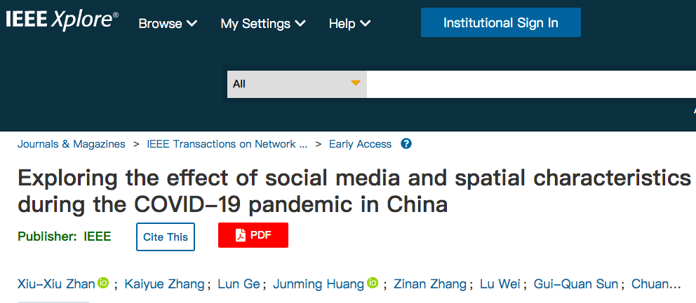 [5] Xiu-Xiu Zhan, Kaiyue Zhang, Lun Ge, Junming Huang, Zinan Zhang, Lu Wei, Gui-Quan Sun, Chuang Liu, Zi-Ke Zhang. Exploring the effect of social media and spatial characteristics during the COVID-19 pandemic in China. IEEE Transactions on Network Science and Engineering. Early Access, DOI : https://doi.org/10.1109/TNSE.2022.3217419.