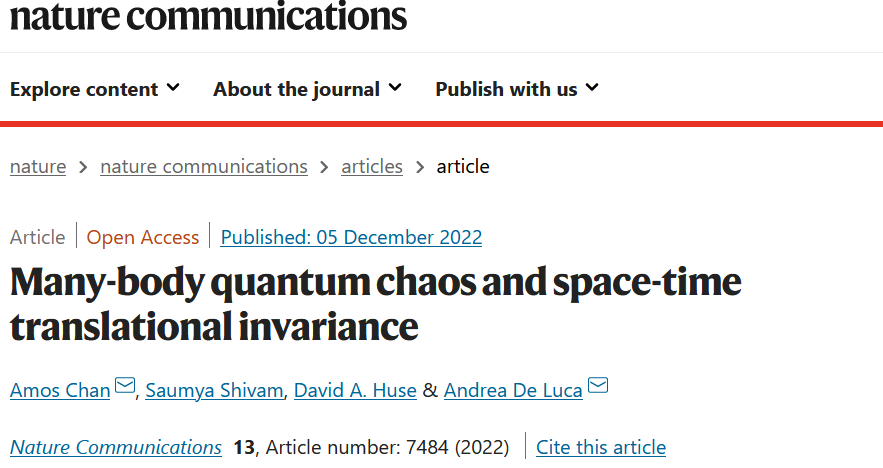 论文题目:Many-body quantum chaos and space-time translational invariance 论文来源:Nature Communications 论文链接:https://www.nature.com/articles/s41467-022-34318-1
