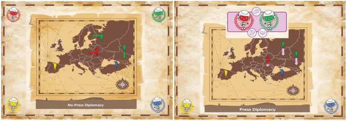 图:对比有压力外交和无压力外交。左图:在无压力外交中,玩家可能不会直接沟通以协调一个联合计划。人工智能体各自选择自己的行动。右图:在有压力外交中,玩家直接与对方沟通,以决定联合行动方案。智能体的算法决定了他们如何商定一个联合计划。我们使用关于未来行动的合同来表达这种计划。在按兵不动的外交中,移动阶段是相同的,下一个棋盘状态只取决于玩家在移动阶段选择的行动。