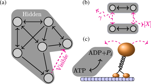 图:只能检测少数可见转变的设备获取的部分信息的插图。(a)我们框架的设置,针对只有一个可见转变的情况。物理系统在状态网络(圆圈)中执行马尔可夫跳跃过程,所有这些状态对外部观察者都是隐藏的。观察者只能看到几个可见转变的发生,而其余的转变在数据采集期间保持隐藏(黑色阴影区域)。(b,c)我们的理论描述的模型示例:(b)光子发射或吸收 γ 和化学物种 X 的合成或消耗是一些转变发生的信号,以及(c)分子马达沿着轨道执行步骤和与沿着轨道的空间运动相关的转变,通过监测物体(橙色球体)的位置,化学燃料消耗(ATP水解)经常保持隐藏状态(灰框)。