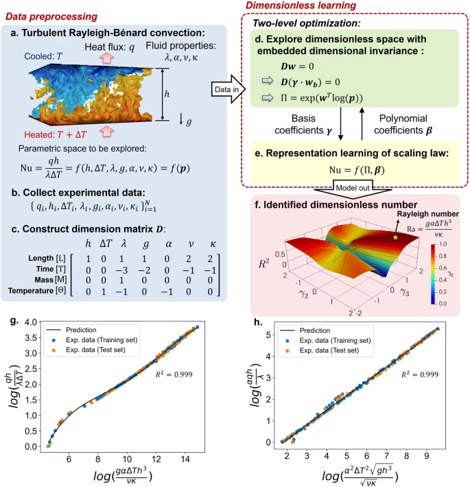 图:所提出的无量纲学习在湍流瑞利-贝纳德对流中得到了证明。(a)具有相关物理量的瑞利-贝纳德对流示意图,(b)收集的实验测量值。(c)构造输入变量的维数矩阵 D。(d)二级优化方案的第一级,用于训练关于计算的基向量的系数 γ。(e)表示学习中优化未知系数β的二级优化方案的第二级。f 用 R2 的度量探索无量纲空间。R2 最大的位置标有黄色星号,对应于经典瑞利数,(g)确定了 Nu 和 Ra 之间的一维比例定律。(h)发现了两个已识别的无量纲数之间的线性比例定律。