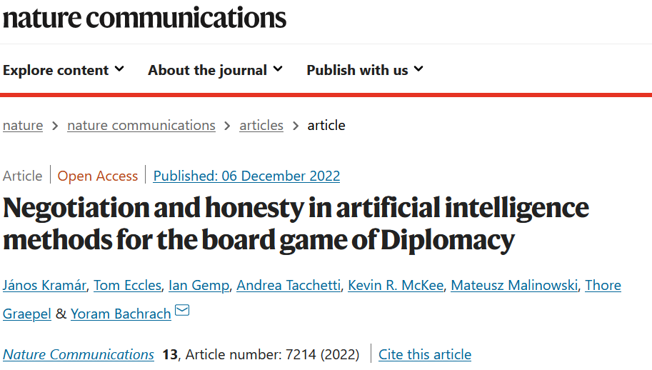 论文题目:Negotiation and honesty in artificial intelligence methods for the board game of Diplomacy 论文来源:Nature Communications 论文链接:https://www.nature.com/articles/s41467-022-34473-5