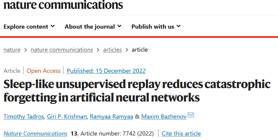 论文题目:Sleep-like unsupervised replay reduces catastrophic forgetting in artificial neural networks 论文来源:Nature Communications 论文链接:https://www.nature.com/articles/s41467-022-34938-7