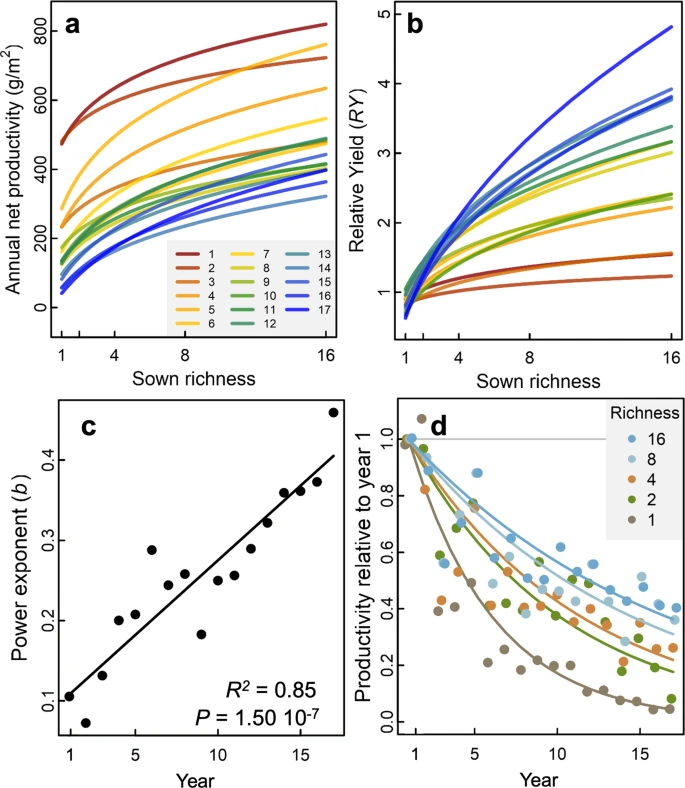 图:播种物种丰富度与生产力的关系。显示了各年播种物种丰富度与(a)群落地上净初级生产力(ANPP在分析前进行平方根转换)和(b)群落相对产量(ANPP除以该年单株平均ANPP)之间的对数线性关系(1=2003,17=2019)。(c)对数关系的斜率,对应于每年每个新增物种的生物量相对于所有单株植物的平均ANPP的增加。(d)群落的ANPP相对于其在第1年的ANPP的变化,对于每个播种物种丰富度水平。