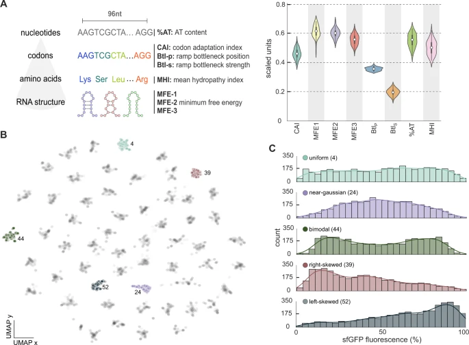 图:训练数据的特征。(A)在大肠杆菌23中采用了一个大型的表型筛选,即在一个可变的 96nt 序列之前的 sfGFP编码基因。(B)对所有 228,000 个序列计算的重叠 4-mers 的二维 UMAP27 可视化。(C)突变系列具有不同的表型分布,通过 FACS 测序将 sfGFP 的荧光归一化为其最大测量值。