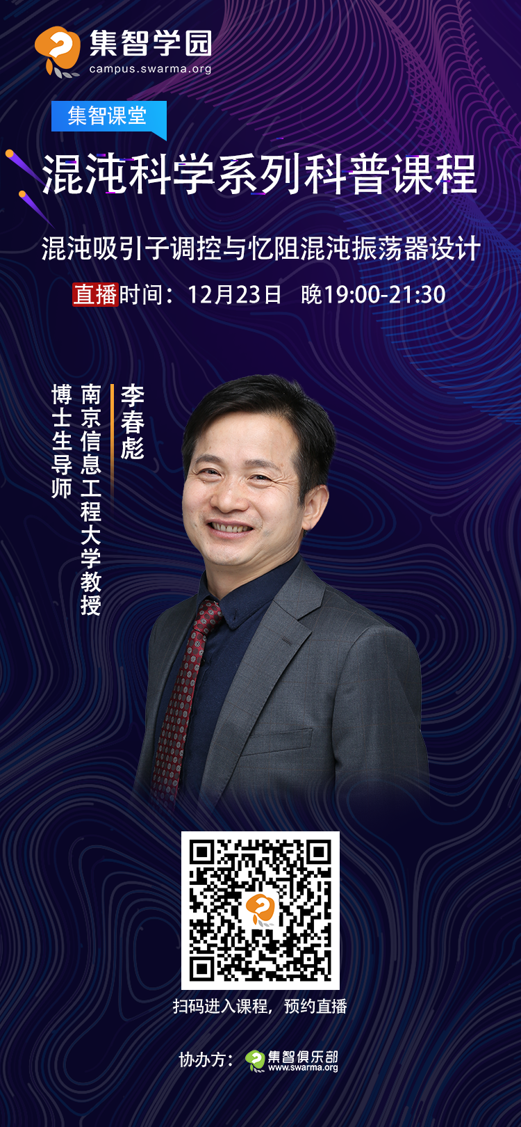 12月23日(本周五)晚19:00-21:30,将由南京信息工程大学人工智能学院教授、博士生导师李春彪老师开启混沌科学第三课,从混沌信号的调幅、调频和调偏置出发,系统介绍一系列具有独立非分岔参数的混沌动力学系统,通过系统参数的调整实现系统输出混沌信号的调理。在此基础上,也结合第四种电路元件忆阻器的建模,重新设计混沌系统,实现基于忆阻器的混沌信号的全面调理。欢迎感兴趣的朋友关注并加入课程,共同探索混沌科学!