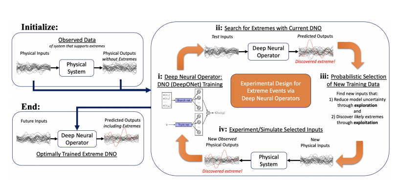 图2. 发现并量化极端事件概率的框架。高效稳健的 DNO+BED 框架,用于发现和量化极值。该框架具有 DNO 和罕见事件获取功能,用于发现极端情况。用一组观察到的物理输入-输出对进行初始化,保留其功能形式。(i) 将函数传递给 DNO 的集合,以学习基础系统的稀疏表示。(ii) 对 DNO 函数空间进行快速的蒙特卡洛搜索,以寻找极端值。(iii) 计算蒙特卡洛集合的统计数据,并选择既能探索又能利用极端空间的新输入函数。(iv) 在基础实验或模拟上评估拟议的输入,记录输出(QoIs)并传递到(i)。重复(i)-(iv),直到统计数据收敛或资源耗尽。以支持预测极端事件的最佳训练的 DNO 结束。