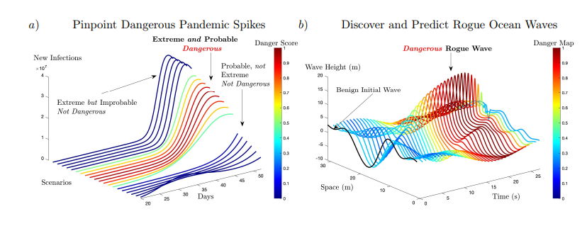 图1. 将该框架用于各种极端现象的推断,从大流行病的高峰(a)到危险的异常巨浪(b)。