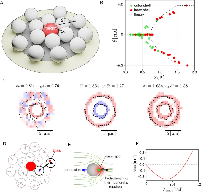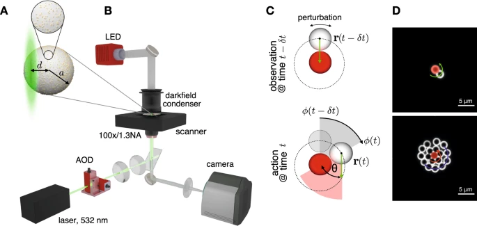图1. 实验的实现。(A)实验中使用的粒子由三聚氰胺树脂胶体(直径2.18微米)组成,表面散布着 8 纳米的金纳米粒子(覆盖总表面积的10%)。一个532纳米的激光聚焦在距离粒子中心 d 的边缘,诱发了自热运动并允许精确控制推进方向。重要的是,光力量很弱,所以粒子表现出真正的自浮游的自主运动,使它们成为合适的微泳器。(B)对颗粒进行成像。(C)粒子自推动的观察。(D)粒子的相互作用。