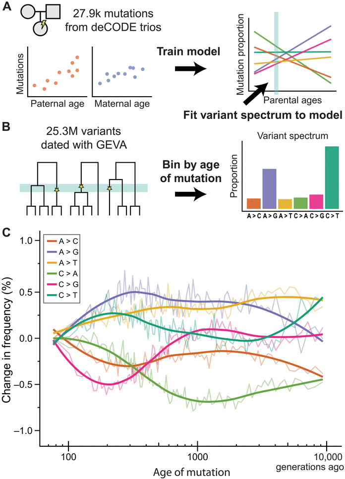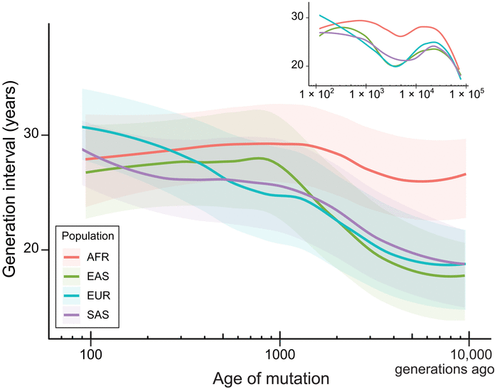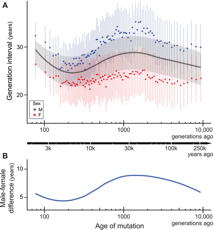 最近祖先的世代时间,可以告诉我们史前人类的生物学和社会组织,将人类进化置于绝对的时间尺度上。在近日发表于 Science Advances 的论文中,研究者提出一种基于突变谱系中的变化,来预测历史上男性和女性世代时间的方法。论文对全基因组数据的分析显示,在过去25万年中,平均世代时间为26.9年,其中父亲(30.7岁)始终比母亲(23.2岁)年长。分性别平均世代时间的变化主要由父亲年龄的变化驱动,尽管论文报告了最近女性世代时间的大幅增加。研究还发现,不同人口的世代时间差异很大,可以追溯到所有人类占领非洲的时代。