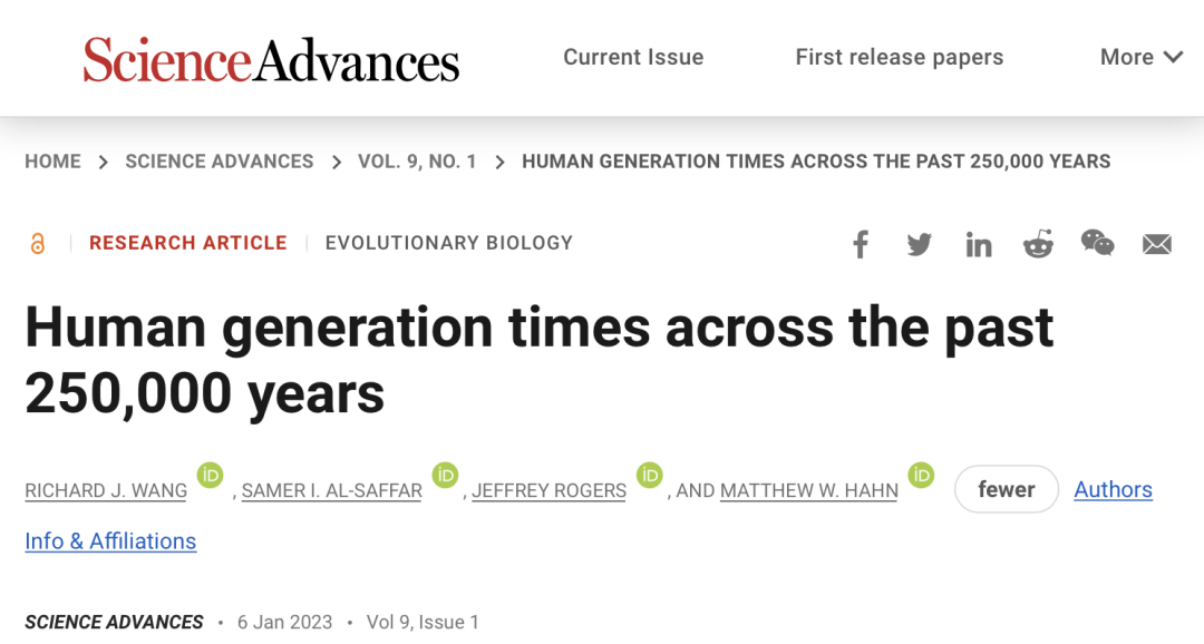 论文题目:Human generation times across the past 250,000 years 论文来源:Science Advances 论文地址:https://www.science.org/doi/10.1126/sciadv.abm7047