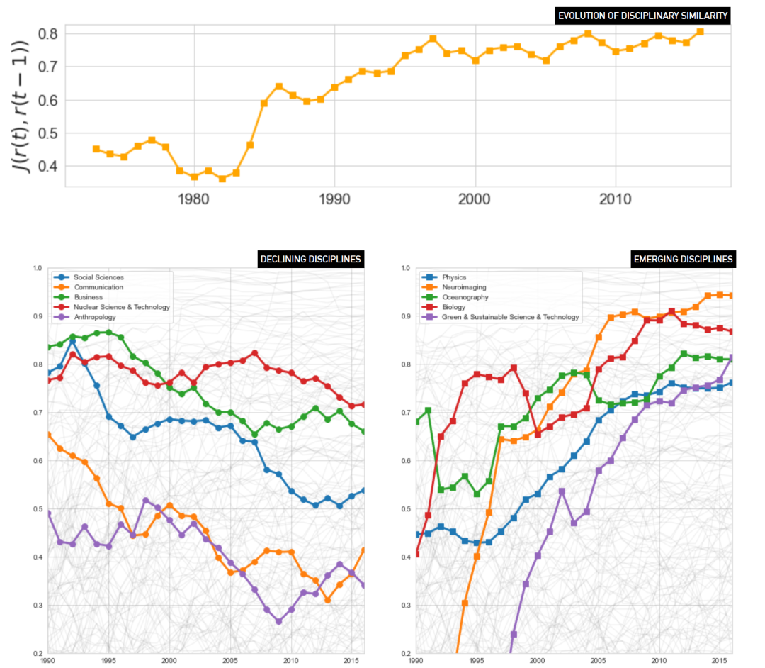 为了衡量人工智能的扩散过程,作者使用了学科排名变得相当稳定排名雅卡德相似度指标,在图3中,可以观察到一些典型的学科轨迹,这些学科的排名从20世纪90年代至今发生了重要变化。