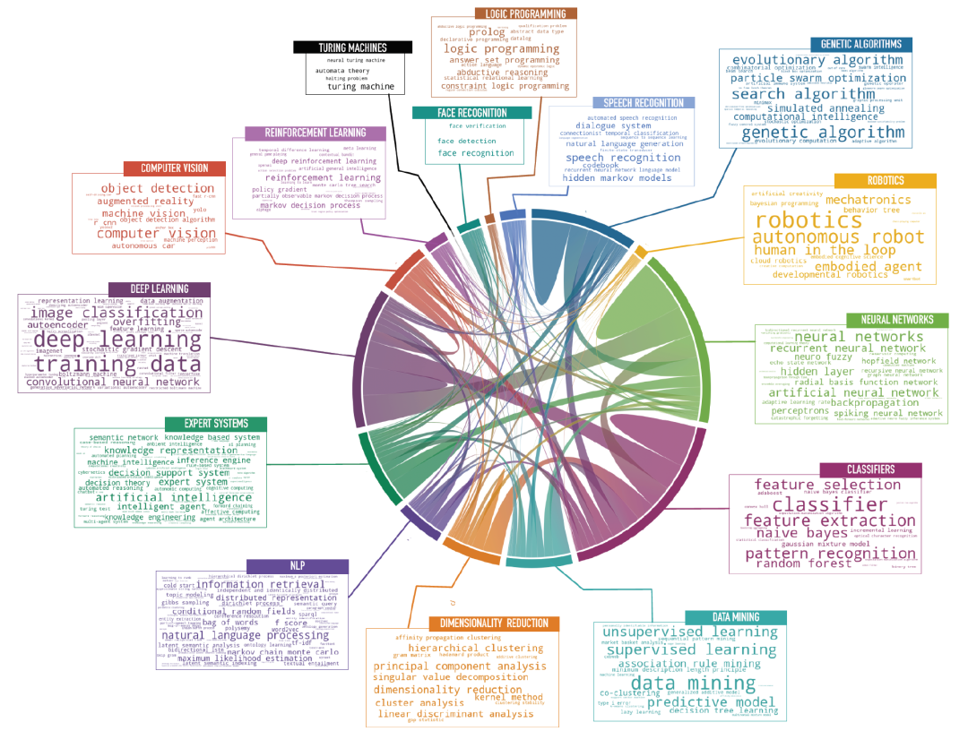 通过社区检测算法,作者确定了15个中尺度结构的存在,这些结构对应于网络在专业层面的划分(图2):专家系统、自然语言处理、降维、数据挖掘、分类器、神经网络、机器人学、遗传算法、语音识别、逻辑编程、人脸识别、图灵机、强化学习、计算机视觉和深度学习。