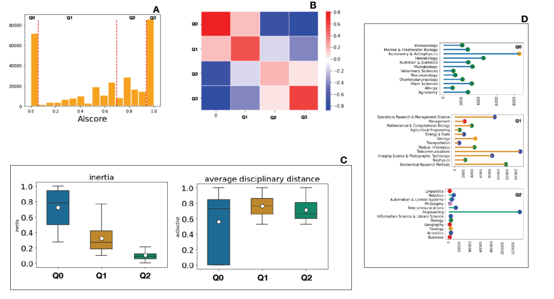 图4. 人工智能领域的合作。(A)作者的人工智能得分的分布。(B)各组作者之间的合作情况。(C)各组作者的惯性矩和学科间距离的箱形图。(D) 排名前10位的学科。