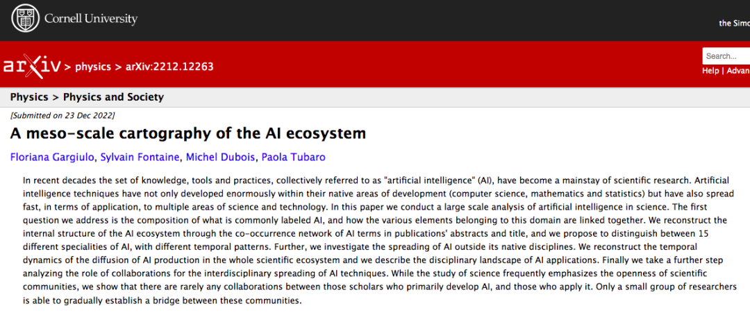 近几十年来,人工智能的知识、工具和实践已经成为科学研究的支柱,而且在应用方面也迅速扩散到各个学科中。通过构建人工智能研究领域的关键词共现网络和作者合作网络,这篇文章重构了人工智能生产在整个科学生态系统中扩散的时间动力学,并描述了人工智能应用的学科介观尺度格局。作者最后发现,那些主要开发人工智能的学者和那些应用人工智能的学者之间很少有合作,只有一小群研究人员能够逐渐在这些社区之间建立桥梁。
