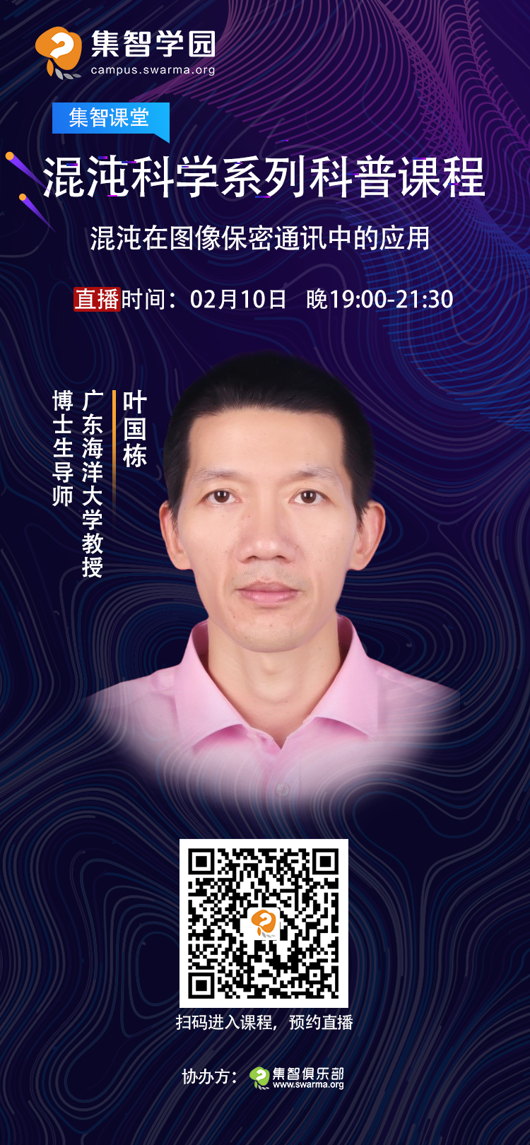 2月10日(本周五)晚19:00-21:30,将由广东海洋大学博士生导师、研究生院副院长叶国栋教授开启混沌科学第八课,主要介绍混沌系统(映射)的简要发展和几种常见混沌模型,描述混沌系统(映射)在图像加密中的应用。特别地,将主要回顾基于混沌加密研究的发展情况,并介绍两类主要的图像隐私保护方案:(1)直接图像加密方法;(2)可逆图像隐藏方法。
