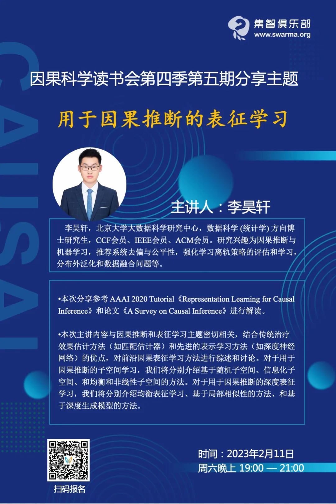 与读书会之间的关系:本次主讲内容与因果推断和表征学习主题密切相关,结合传统治疗效果估计方法(如匹配估计器)和先进的表示学习方法(如深度神经网络)的优点,对前沿因果表征学习方法进行综述和讨论。对于用于因果推断的子空间学习,我们将分别介绍基于随机子空间、信息化子空间、和均衡和非线性子空间的方法。对于用于因果推断的深度表征学习,我们将分别介绍均衡表征学习、基于局部相似性的方法、和基于深度生成模型的方法。