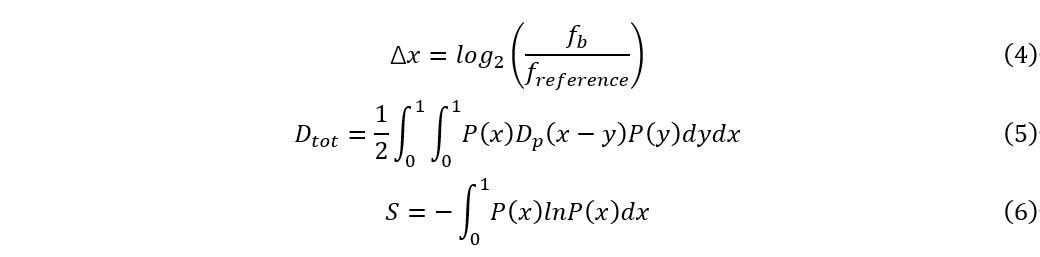 其中,式(4)代表一个音和其他音产生的平均场之间的频率差距。式(5)用来计算整个系统的不协和度。为音高为“x”的音的概率,代表所有音与音高“x”的音形成的不协和度的总和,积分区间为(0,1]是因为设定了周期性边界条件,(0,1]代表一个八度,积分函数都满足这个周期性的边界条件。最后式(6)表示的是这个系统的熵。