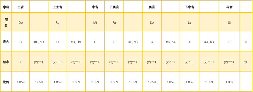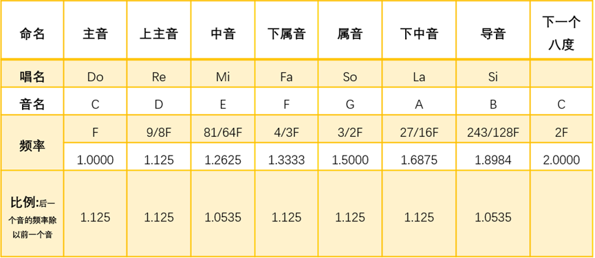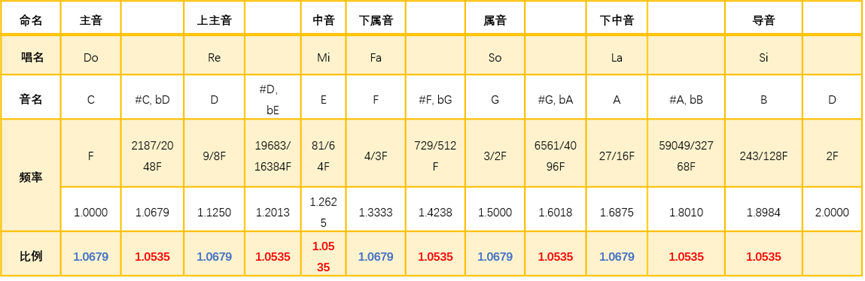 表1-1:五度相生律演化出来的八度音阶(注意:音名其实是与固定音高的声音一一对应的,比如C4=261Hz,A4=440Hz)