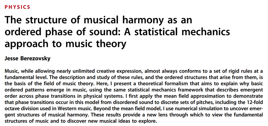 [1] Berezovsky J. The structure of musical harmony as an ordered phase of sound: A statistical mechanics approach to music theory[J]. Science Advances, 2019, 5(5): eaav8490.