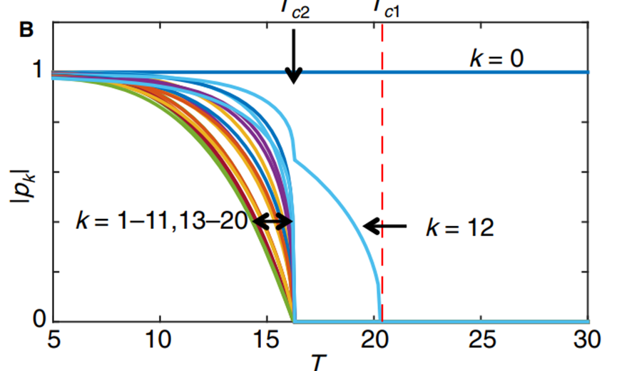 同样,我们也可以绘制公式(7)中序参量随温度变化的规律。根据图2-4,似乎可以发现整个系统的“冷却”过程存在一种二阶相变。在这两个临界温度之间存在一种十分稳定的状态——即“十二平均律”阶段。