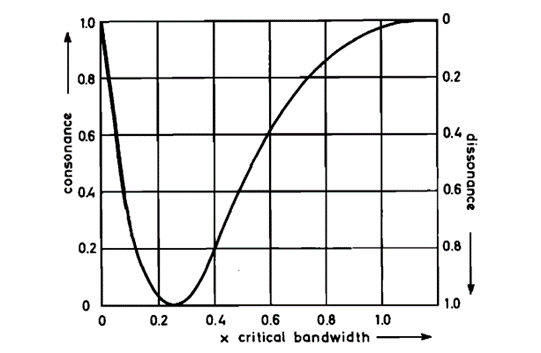 再回到图1-3,我们可以知道当两个音的音程处于临界带宽内的某一个值时会存在一个最大的不协和的点。由于低频区与高频区临界频带不同,这个位置也不会相同。