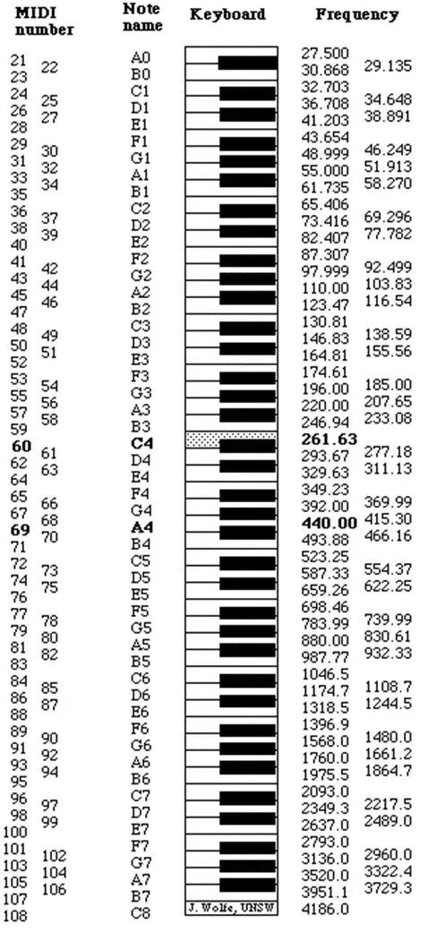 十二平均律 (表1-3) 的原理并不复杂,既然是平均,那就是每个音之间的频率之比是一样的。因为一个八度为[F,2F],那么就直接把这个1:2的关系分成十二份,每一份就是(2)1/12 =1.059,这样虽然损失了一部分完美的协和频率比,但是这套律法能够为记录和创作乐曲提供了更多可能。乐器之王钢琴上的每一个键对应的频率都可以通过十二平均率推算出来 (图4) 。